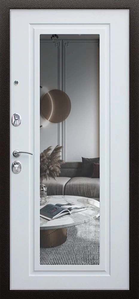 Надежная входная Дверь Комфорт с зеркалом премиум класса по цене 31 247 руб. Большая толщина стали защитит от проникновения в ваш дом, квартиру или коттедж. Используется очень качественная фурнитура: замки, цилиндры, ручки, защелки. Покрытие и отделка двери изготовлено под внимательным контролем производителя. Дверь имеет долгий срок службы и гарантию.