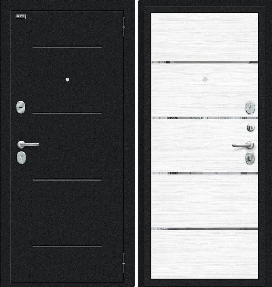 Надежная входная Дверь Браво Лайн Букле черное/Snow Melinga премиум класса по цене 32 817 руб. Большая толщина стали защитит от проникновения в ваш дом, квартиру или коттедж. Используется очень качественная фурнитура: замки, цилиндры, ручки, защелки. Покрытие и отделка двери изготовлено под внимательным контролем производителя. Дверь имеет долгий срок службы и гарантию.